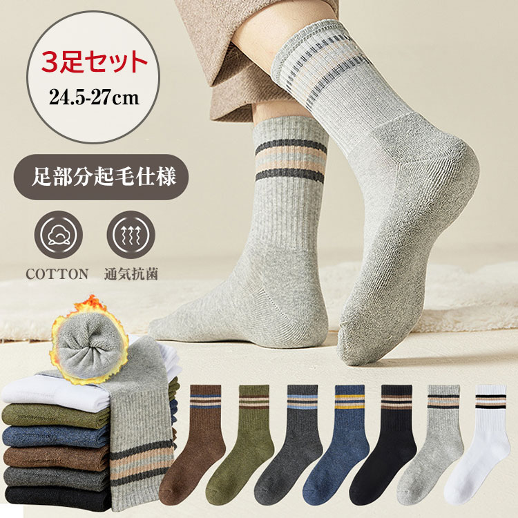 足部分裏起毛 靴下 メンズ カラーソックス 秋冬 綿 メンズ靴下 アウトドアソックス おしゃれ くつした 男性用 カジュアル 厚手 クルーソックス 通気 抗菌 登山 くつ下 24.5-27cm