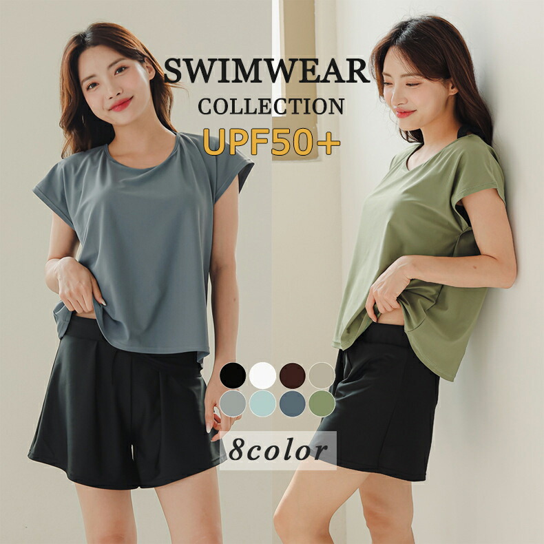 水着 レディース 体型カバー水着 UPF50+ ママ水着 セパレート 大きいサイズ レイヤード風 半袖ラッシュガードセット ショートパンツ 2点セット 黒 白 かわいい 服みたいな ウエスト調節 30