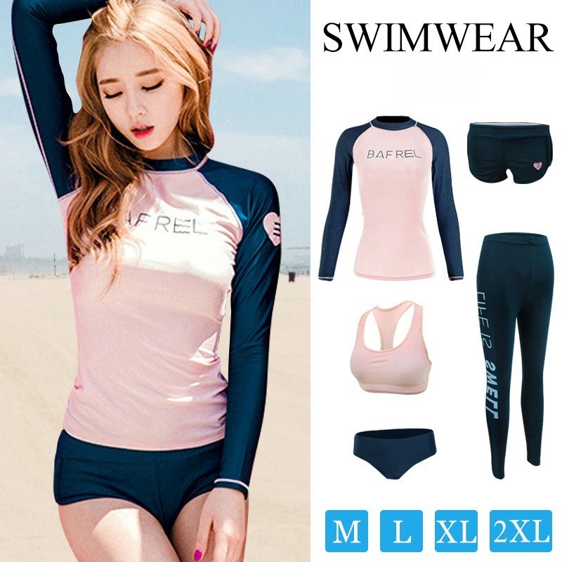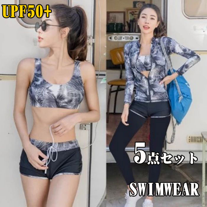 フィットネス水着 ダイビングスーツ クラゲスーツ サーフスーツ レディース セパレート ビキニ ラッシュガード ショートパンツ レギンス 上下5点セット ノンワイヤー パット無し パンツ 体型カバー