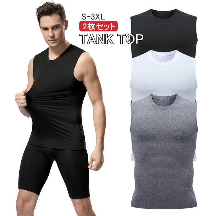 2枚セット コンプレッション タンクトップ メンズ ノースリーブ トレーニングウェア スポーツインナー パワーストレッチ 袖なし アンダーシャツ 通気性いい 吸湿 大きいサイズ 3色 S-3XL