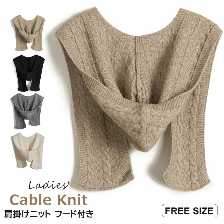 フード付きレディース用肩掛けケーブルニット♪ レディース 肩掛けニット ケーブルニット フードマフラー フード付き マフラー ストール 肩掛け ニット ニットマフラー ショルダー トップス 防寒 全4