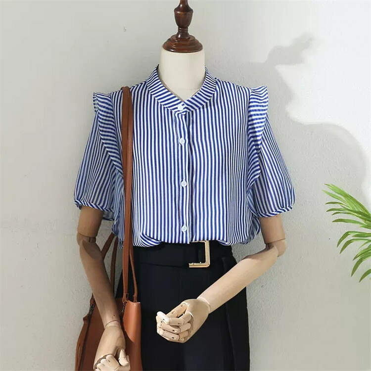 シャツ ストライプ レディース トップス ブラウス 半袖 バンドカラー スタンドカラー 薄手 フリル ゆったり 春 夏 秋 柄 ストライプ柄 バンドカラーシャツ